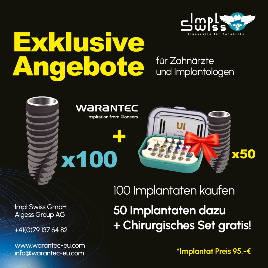 Special Offers Amazing Offer for Dentists and Implantologists! Posted by Helen On 5. February 2025 0 comments Expand Your Possibilities with WARANTEC! Right now: When you buy 100 implants, you get: 50 additional implants for FREE – save time and money! A premium surgical kit COMPLETELY FREE – everything you need for your work is included!Price per implant – only €95!This exclusive offer is available for a limited time only! Visit us at IDS Cologne and get personalized advice:Hall 11.3, Stand C40–E59. Contact us:📞 +41 (0)79 137 64 82📞 +49(0)7621 161 37 25 🌐 www.warantec-eu.com ✉ info@warantec-eu.com Trust the leaders in innovation!Warantec – your partner in the world of implantology! Leave your feedback Please enable JavaScript in your browser to complete this form.Name *Email *Telephone *Leave a review *Leave a review See all reviews